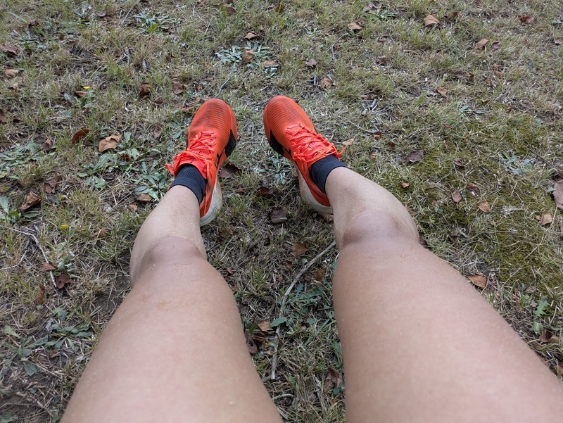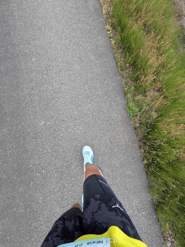 シューズを忘れてしまって履き慣れていないシューズなので、右足の着地でつま先が外側に向いていたので矯正して走る。