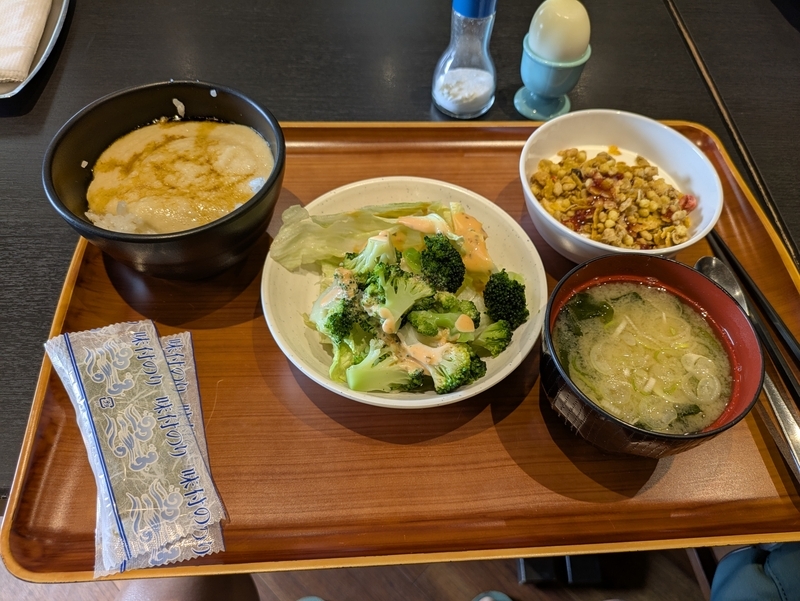 朝食はお餅3個をカップみそ汁にドボンのみ。