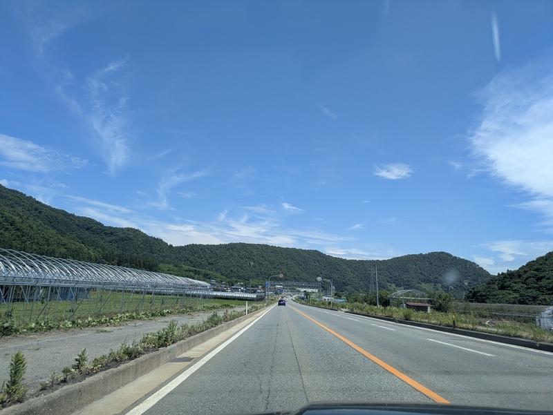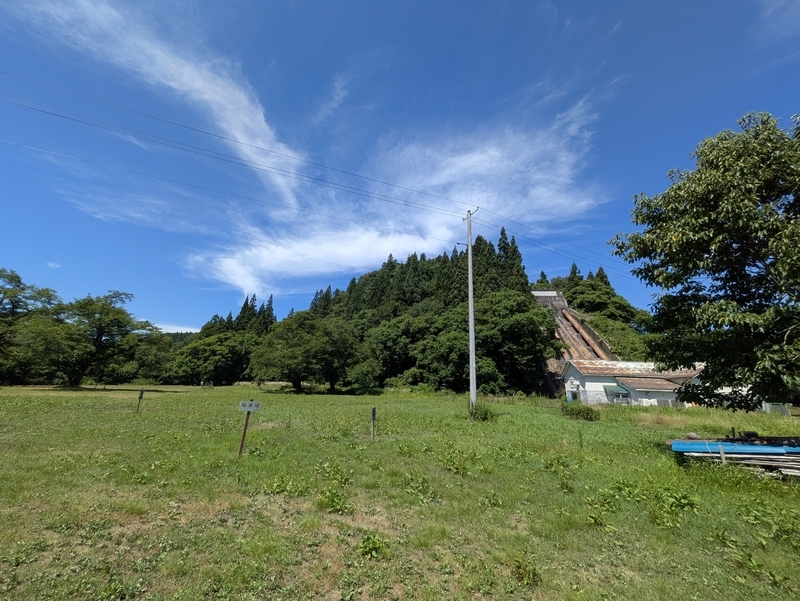 農道沿いにある牛舎に牛さんの姿はなかった。お散歩中かな?