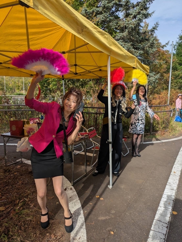 完走した美女に囲まれて28kmで終わった不甲斐なさに苦笑い。